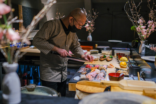 恵比寿駅徒歩2分に位置する【鮨五十六歩】は、厳選された旬の魚介と熟練の職人技が織りなす極上の寿司を楽しめるお店です。大人の隠れ家のような落ち着いた空間で、一貫一貫に心を込めたお寿司を厳選した日本酒と共にぜひご堪能ください。
