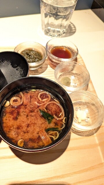 お味噌汁+もずく+自家製ダレ+柚子胡椒+辛子マヨネーズ