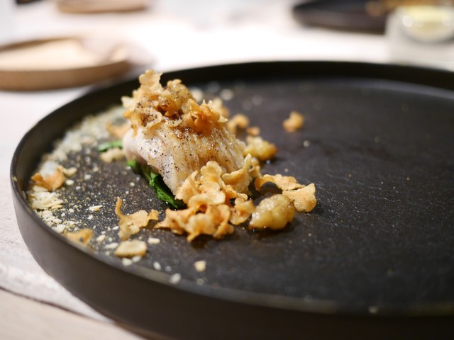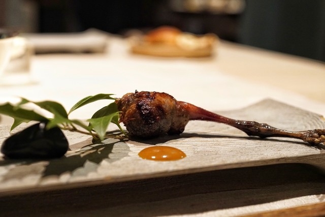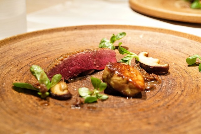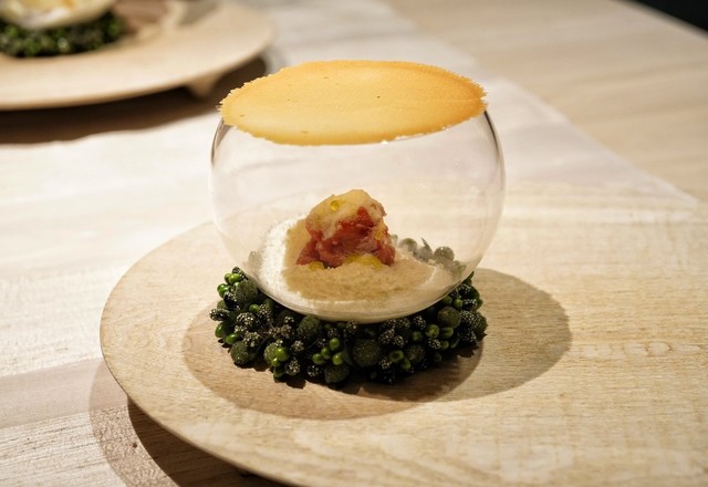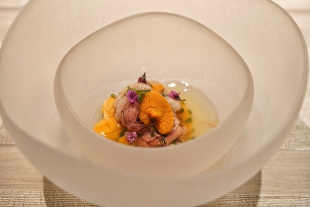 鱧はなんと身は無くジュレと贅沢仕様。鱧&ウニの魚介の香りに大葉のソース、プチプチした何かの食感にハーブの香り、触感もかおりも複雑で特に好きでした。