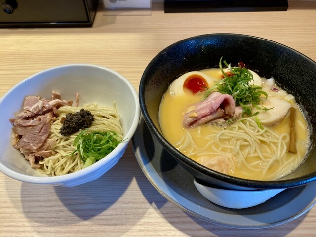 連日行列ができる人気店。上品な味わいが人気の中華そばは、3種のジューシーなチャーシューがのる綺麗な盛り付けの一杯。鶏を極限まで煮詰め搾り上げた高濃度の「鶏搾りつけそば1,200円」、大量の鶏ガラからとった濃厚な旨味の「濃厚鶏そば1,100円」もオススメ。