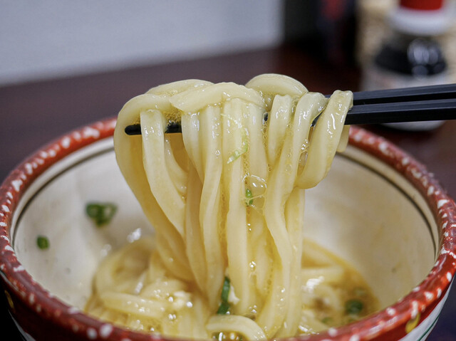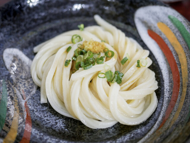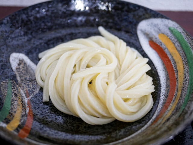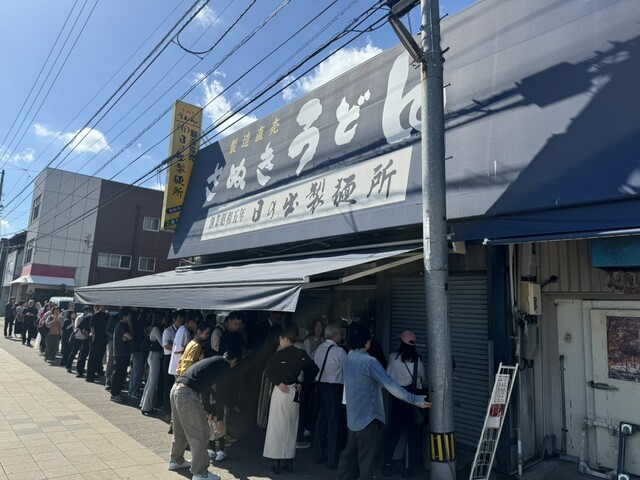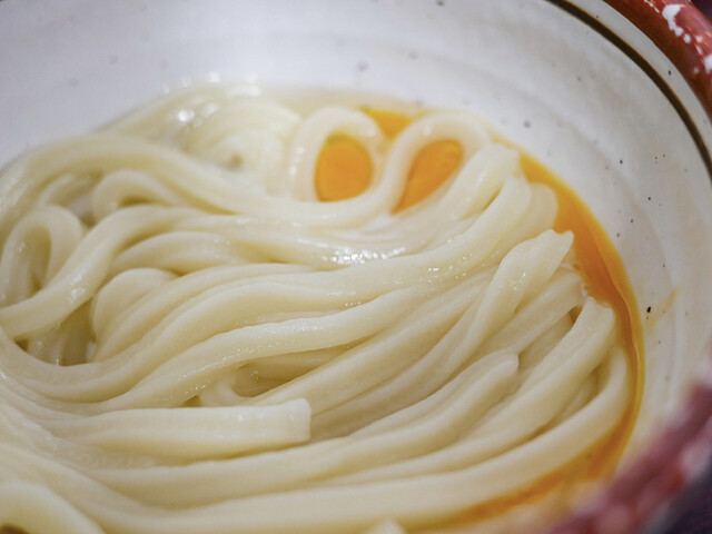 土曜日の11時10分頃到着、50〜60人の行列。かなり待つと思っていたが、11時30分頃には入店できた。行列中に店員がうどんの種類を聞いてくれ、入店後に自分でトッピングを選択。