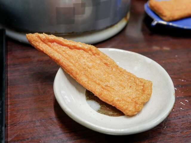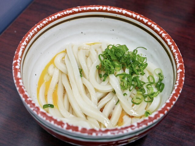熱いうどんを注文、提供時はスープ別で自分でかけるスタイル。トッピングにあげと温泉卵を選んだ。うどんは驚くほど柔らかくもちもち食感で、あげの濃い味がすごく合って最高。