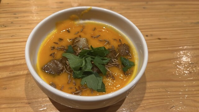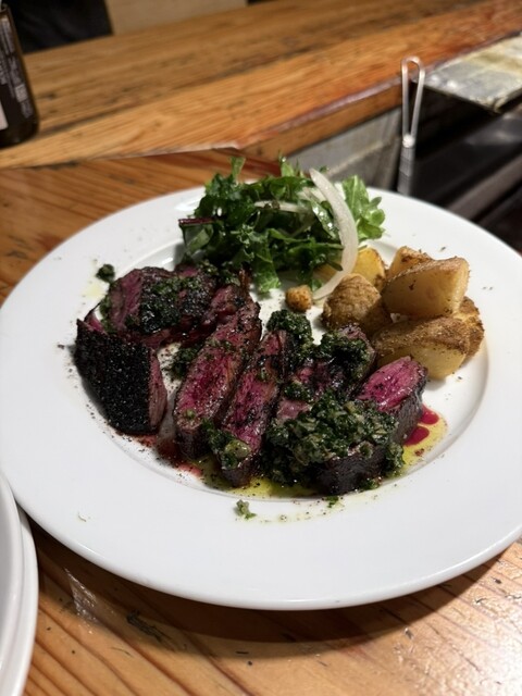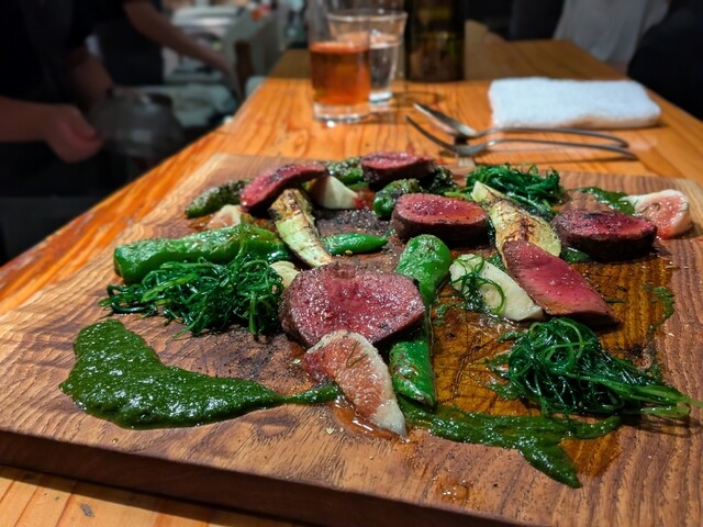 以前から気になっていたがどこで見つけたかは定かではなかった。代官山駅から坂を下り5分ほど歩くと看板がある。お店は地下にあり、店内は中心に薪や炭用の調理場、そこを囲むように木のカウンター,