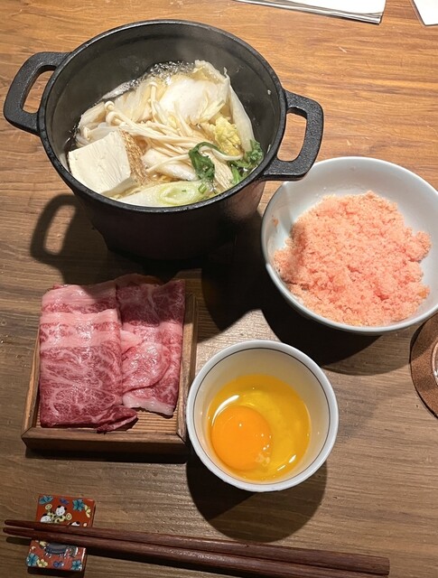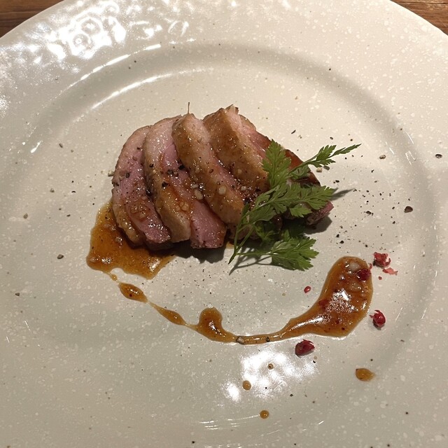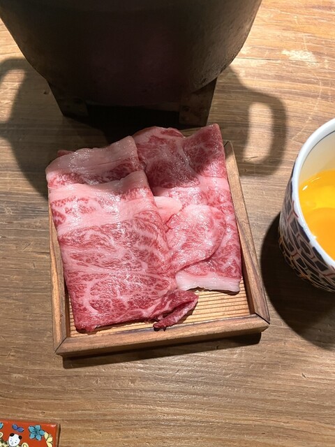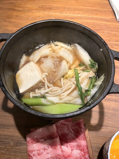 初めの揚げチーズから期待値が上がり、お刺身で燻製のお醤油などと頂くことができました。そして楽しみにしていたお肉たち!鴨のローストは柔らかくて美味しかった。そしてほぼメインなすき焼きは、トマトシャーベットと一緒に食べるという初めての食べ方。お肉は燻製卵にたっぷり付けていただきました。野菜をシャーベットと食べると甘みが増し、タレの、旨さもより際立つ感じ!