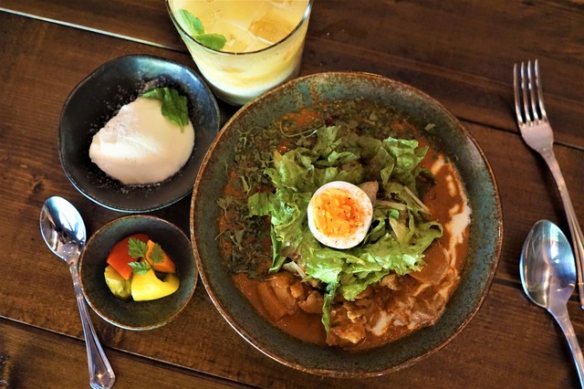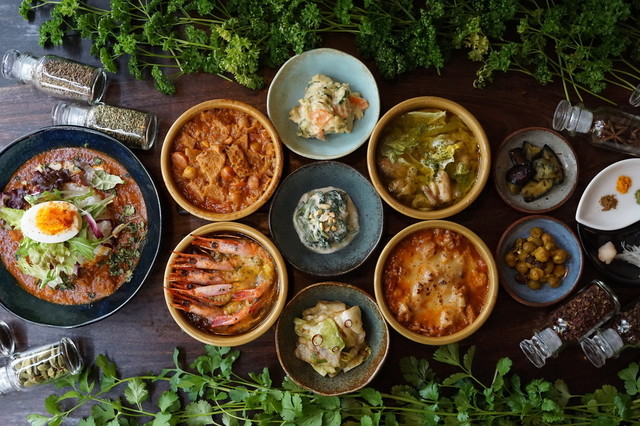 9種類のスパイスを配合した「スパイスカレー」はもちろん、自家製のジンジャエールや手作りスイーツなど、40種以上のスパイスと食材の融合をお愉しみいただけます。アルコールも多数ご用意◎エリアごとにコンセプトの異なる店内は、オーナーセレクトの本がセンス良く飾られ、テラス席ではペットもOK♪お一人様でもお気軽にお立ち寄りいただけます。デートやご友人との語らいに、時間を忘れゆったりとお過ごしください。