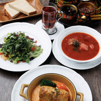 グルジア共和国代表メニューのシュクメルリをメインに、スープにはハルチョー、そして当店一番人気フレッシュサーモンのブリヌイパンケーキ包みの組み合わせです。お食事後にはロシア紅茶を。 ●食べログ経由2時間の席(お会計は15分前)ですが、お席に余裕があれば時間延長が可能な場合がございます。ご希望の場合には、事前に電話にてお店まで直接お問い合わせをお願いいたします。