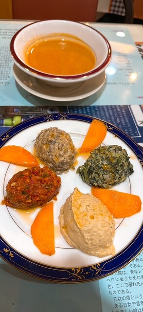 ランチセット 日替わりスープ、パン(エキメッキ)、紅茶付き ・スープ マッシュルームが細かく刻まれたものが入った謎スープ、おいしい ・パン ピタパン、薄いけれどボリュ... 詳細を見る