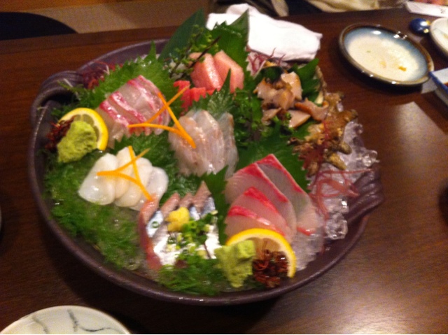 鮮魚盛りは、なんといっても魚が新鮮。数種類の魚貝が盛られていたが、どれも大変美味しい。