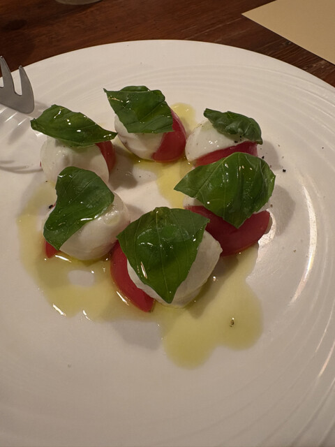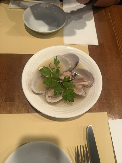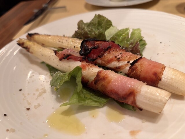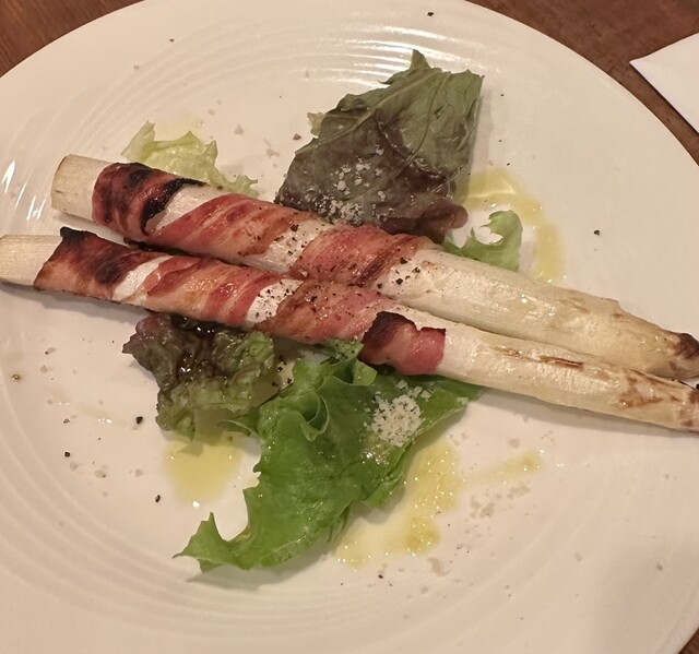 今回はその中から、鮑と肝の手打ちリングイネと、ホワイトアスパラのパンチェッタ巻きを注文しました。
