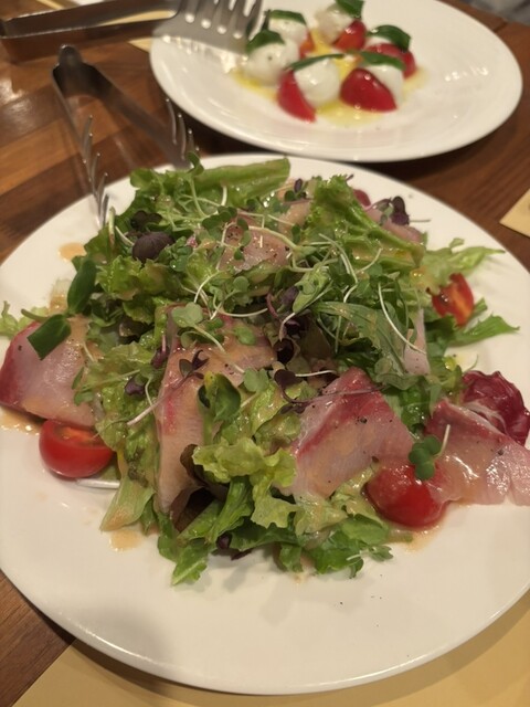 サラダ仕立てのタイのカルパッチョは洋風ワサビドレッシングで爽やか、沖縄豚のソーセージはジューシー。