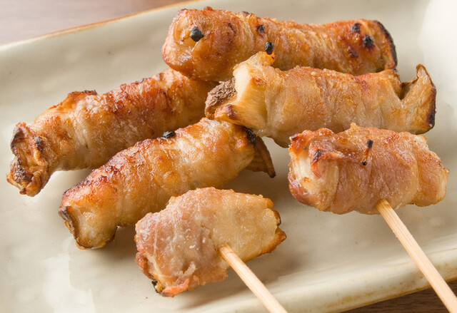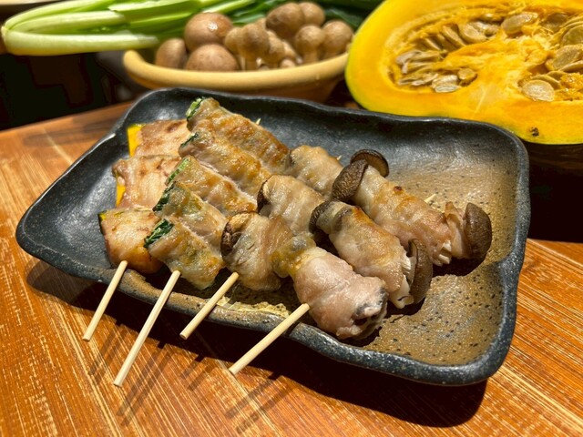大ガードそば、地下にある串焼屋。野菜を豚バラ肉で巻いた『新宿 まき串』の串タロー。