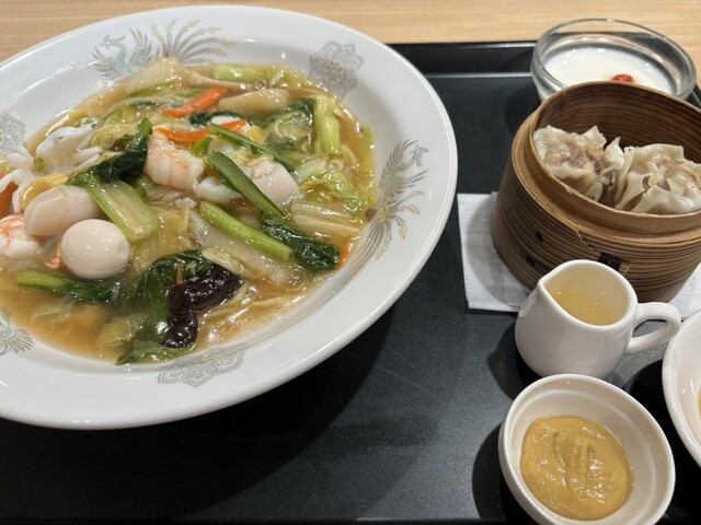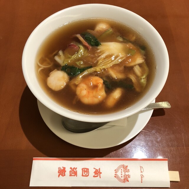 金曜17時、夕飯には早い時間帯のためかどの飲食店も空いていました。今日は15時に腹部エコー検査のため9時から絶食していたのでめちゃ空腹でガツっと食べたく中華で且つ麺類をと思い南国酒家さんへ。スタッフさんにエスコートされて奥のテーブルに着席。まずはキリッと冷えた生ビール(小)で喉を潤して海老蒸し餃子(660円/2個)をいただきました。海老は小ぶりなためか海老本来の風味が感じられません。五目具だくさん...