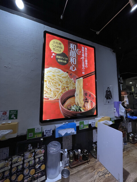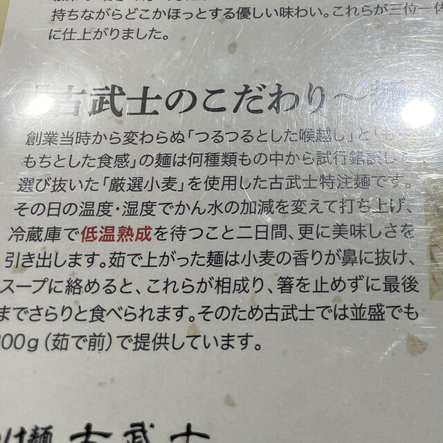 次回、ご来店の際には是非濃厚つけ麺をお試しいただきたいです!魚介の風味が強く、”どろり”とした濃厚なスープに極太の麺が良く合い、パンチのきいた”つけ麺”です。またのご来店を心よりお待ち申し上げます。今後も古武士を宜しくお願いいたします。