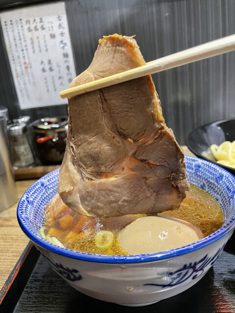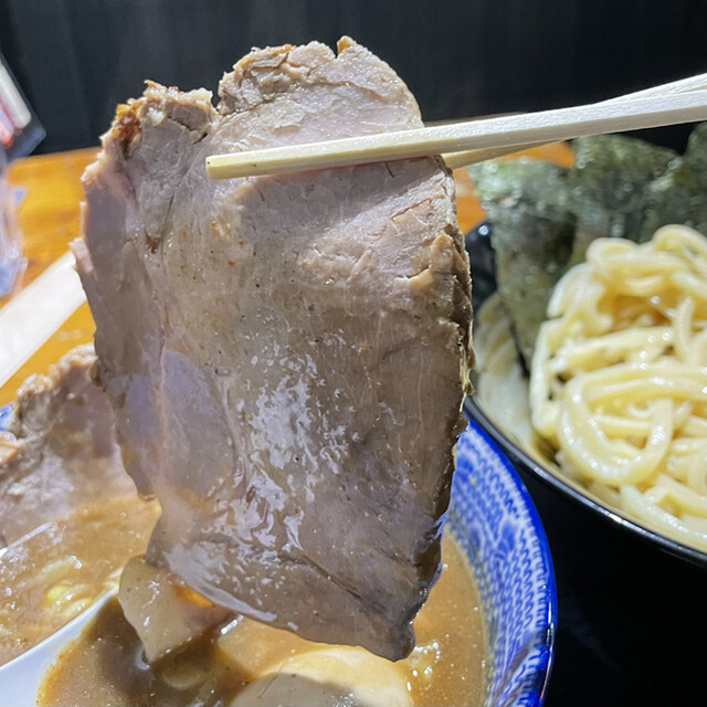 巨大チャーシューが、ホロホロで美味しい。つけ汁の中で待機なのでシンプルな味が嬉しいです。