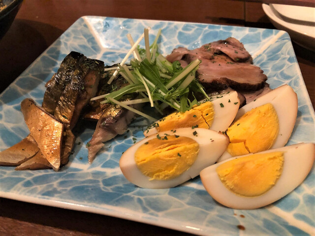 鯖、ポーク、卵のスモークの盛り合わせ。