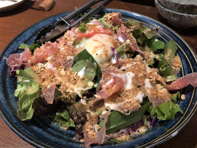 ベビーリーフやルッコラなどの葉物の上に生ハムと温玉。