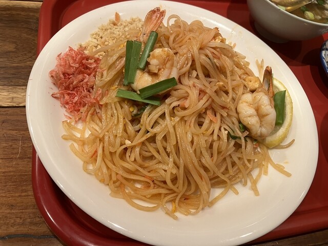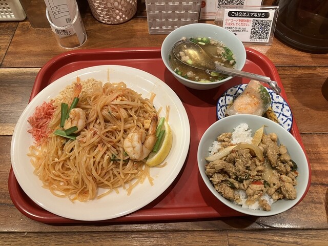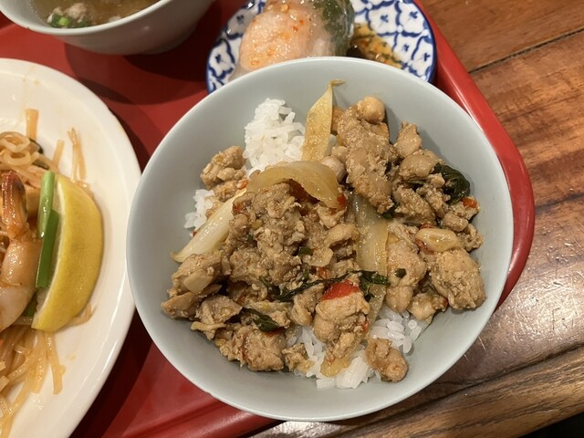 一番人気のカオサンヌードルの他、通好みの麺メニューが揃う。ガパオ、パッタイ等のタイ屋台飯、一品料理も充実。ミニ生春巻、ミニ春雨サラダ等のセットも選べるので一人でも気軽に食べたいメニューをお安く楽しめます!定番ガパオは鶏肉、豚肉、シーフードの3種類と大好評。感染症防止対策を行っております。