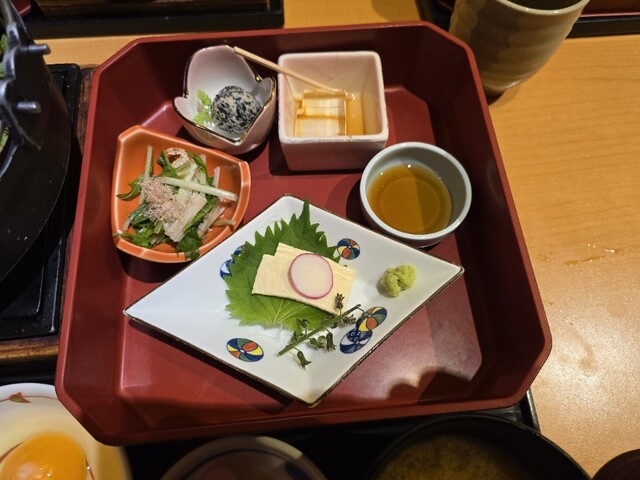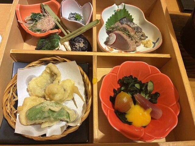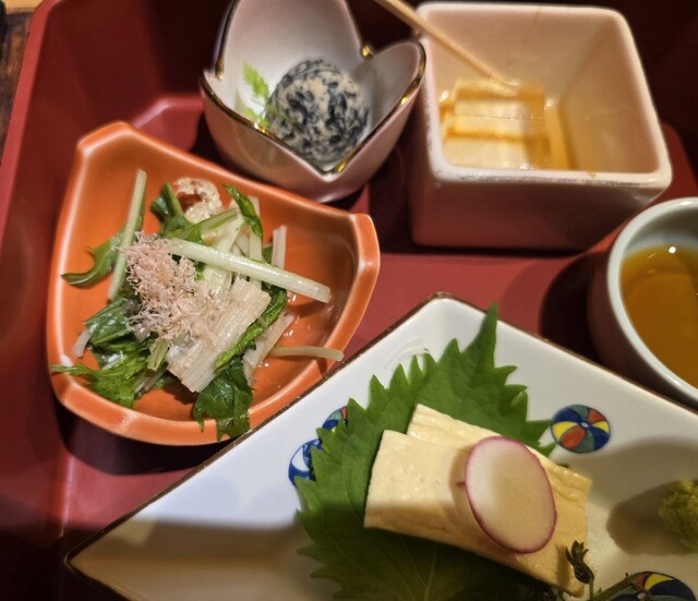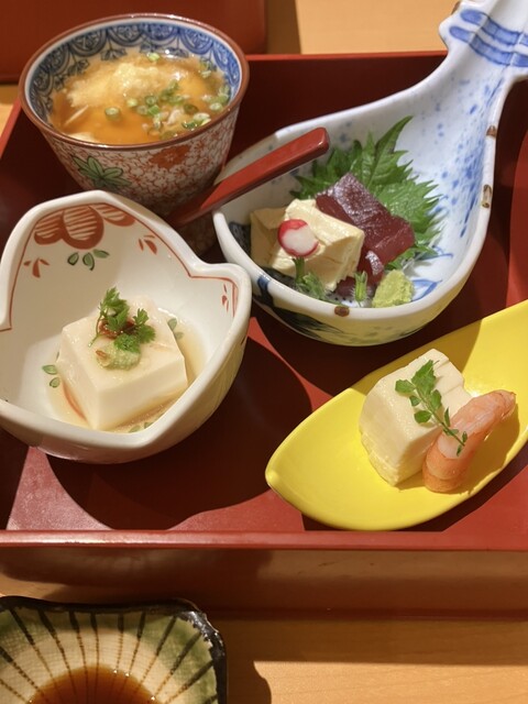 きちんとした和食を落ち着いて食べたいな、と思い、こちらに出会った。 小ぶりの海老天と、シシトウの天ぷらがのったミニ天丼、お出汁の味がついた濃厚な味わいの美味しい冷たいおとうふ、田楽、ガンモの煮付け、ひじきとおからの和物、もっちり豆腐(小鉢名は筆者による)などが、可愛らしい器に盛られて並ぶ。 ... 詳細を見る