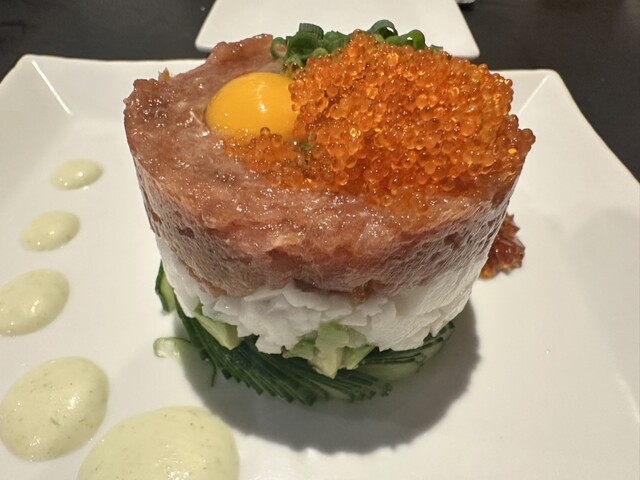 更には「ネギトロとアボガドのタルタル(1400円)」、これは海苔に巻いて食べるのですがヤバいほどの美味さ!