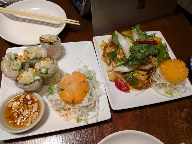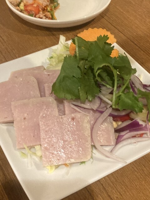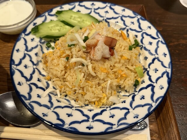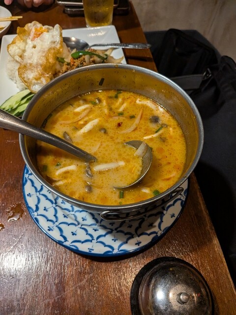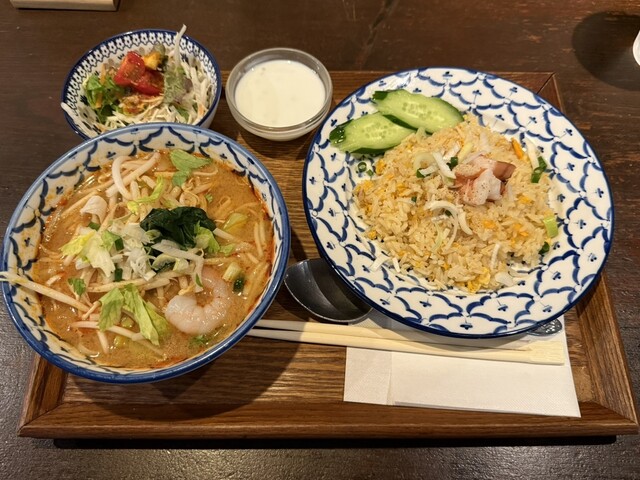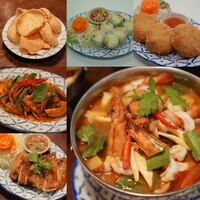 【店内】 地下に続く階段にもタイの民芸品が陳列。 茶色基調のゆったりとした雰囲気の店内。 カウンターが5席、2人掛けが4卓、4人掛けが3卓、6人掛けが1卓。 BGMはタイの歌謡曲。 【店員】 厨房に男性と女性が1名ずつ、ホールに女性が1人。 いずれもタイ人。 【メニュー】 ... 詳細を見る