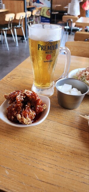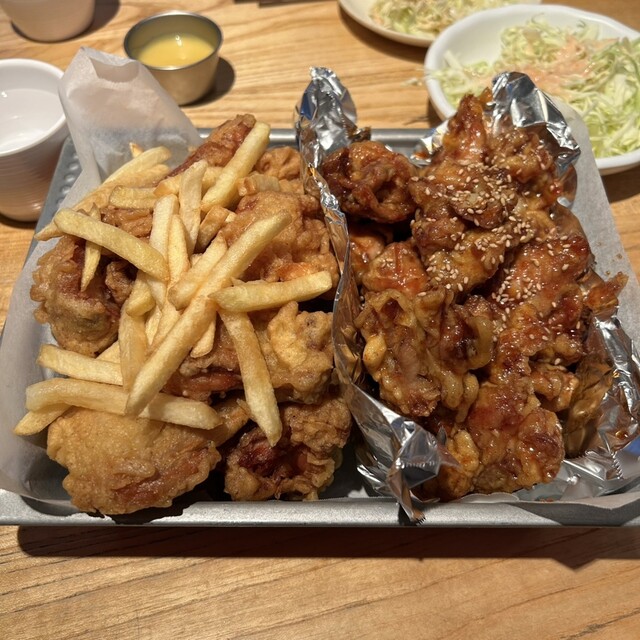 チリセットは唐揚げ3〜4個とソフトドリンクが付きます。唐揚げはソースが選べて、ヤンニョム、...