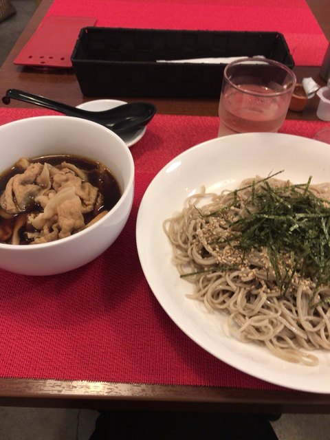 店内中程のテーブル席に案内してもらい、今回は豚肉とキノコが入ったピリ辛つけ蕎麦とアイスコーヒーを注文!