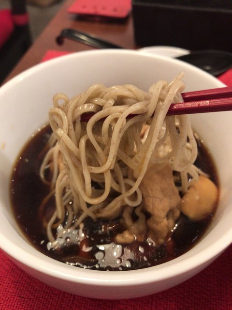 蕎麦はとても食べやすく、豚肉とキノコとピリ辛つゆとの相性がとても良い…!