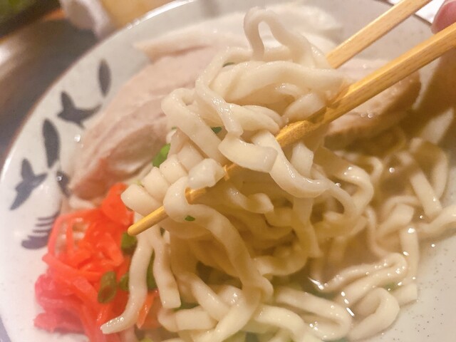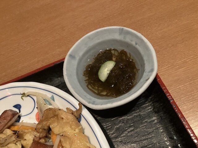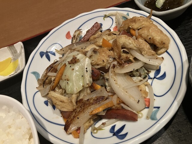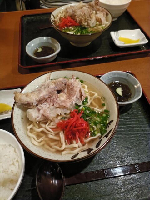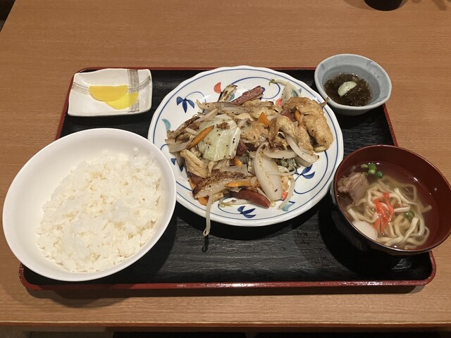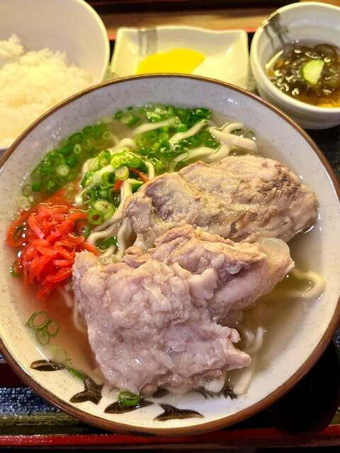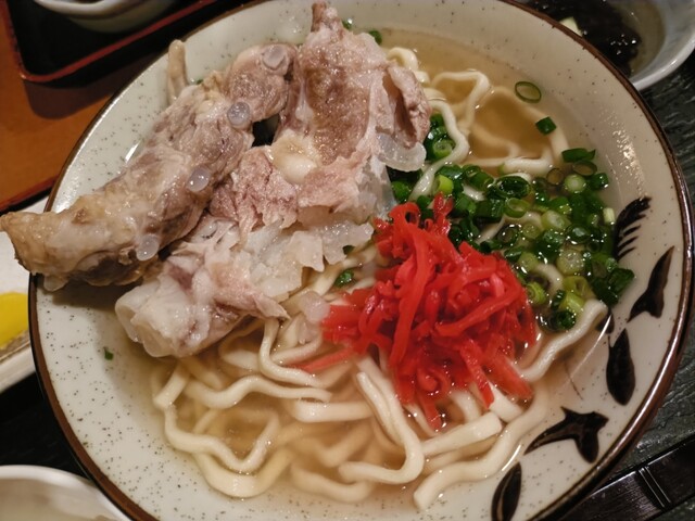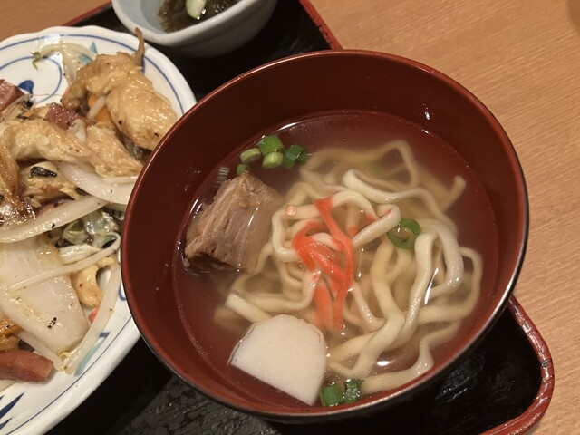 お酒を飲まないので前回気になっていた「夜の定食」をゴーヤーチャンプルー、飲み物はさんぴん茶でオーダー。沖縄そばはプラス150円でもちろん、ソーキそばに変更。