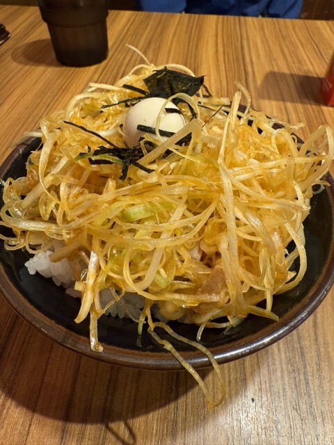 しばらくして着丼。備え付けのニンニク少々、刻みタマ...