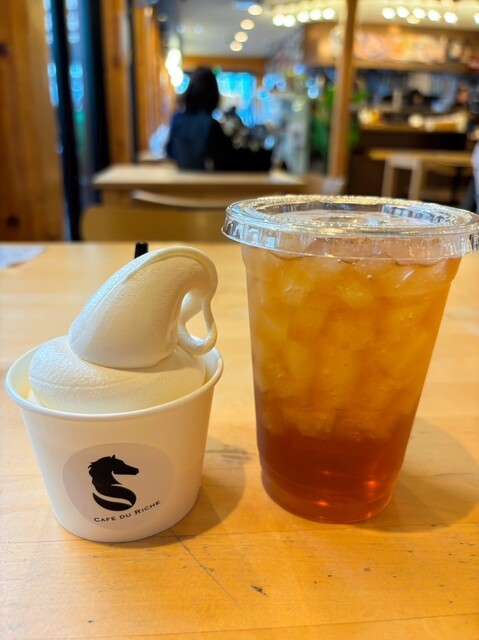 美味しいソフトクリームが食べたくてたどり着いたこちら!一押しの牛乳ソフトクリームと美味しそうだった桃アイスティー頼みました♡