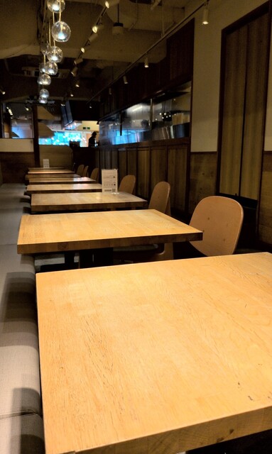 店内は、木目調でカウンター席とテーブル席があります。通路は広めにとってありますが、席と席の間隔は狭いので、混雑時はすこし居心地よくないかもです。