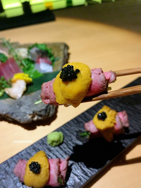 人気メニューは【和牛巻き雲丹のせ】。雲丹の濃厚な旨みが口の中に広がり、日本酒とも相性抜群。酒のつまみからメインの逸品まで心ゆくまで堪能できます。