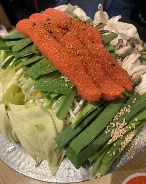 たっぷりのニラとキャベツ、きのこに、どーんとのった明太子がインパクト抜群。