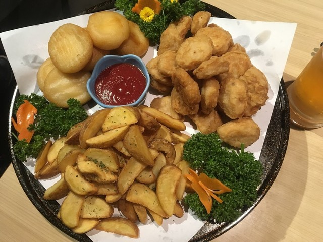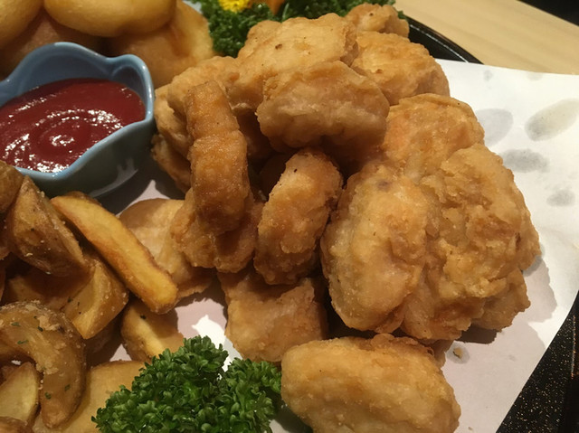 皿に乗っている料理は、ナゲット、ポテト、チーズ芋餅。驚いたのは、その量!皿の大きさは30cm以上ありそうです。