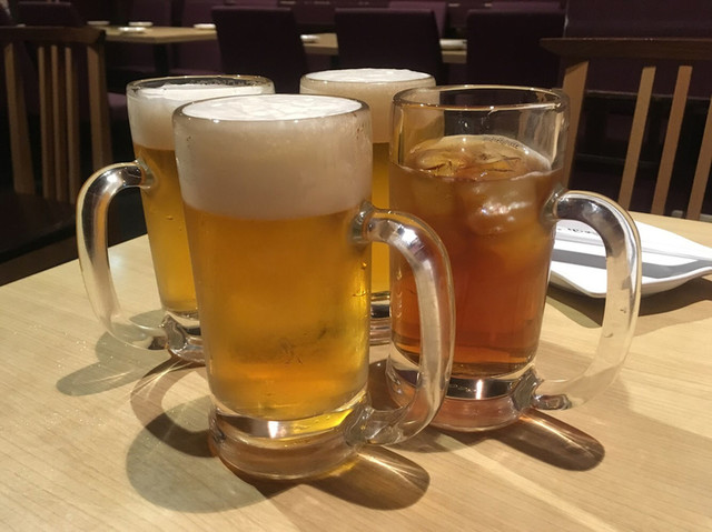 まずは、飲み放題メニューの中から、ビールとウーロンハイで乾杯! 忙しいのにかかわらず、店員さんが素早く提供してくれました。