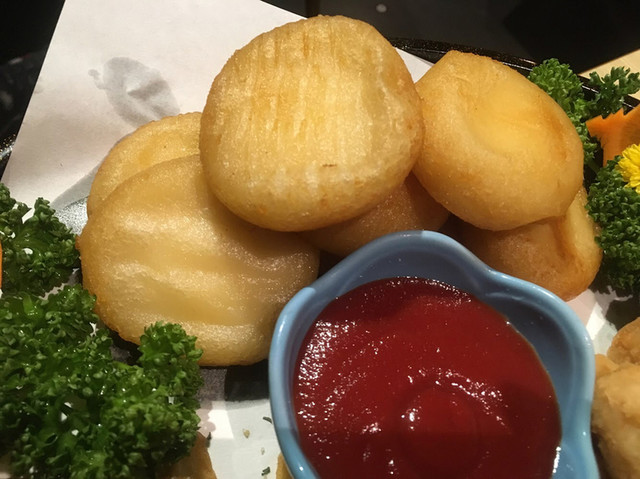 ケチャップをつけて食べるもよし、つけずにそのまま食べてもよし。この3種の揚げ物、カラッと揚げられていて美味しい。 僕は、中でもチーズ芋餅が口の中でやわらかくとけるようで、美味しかったですね。