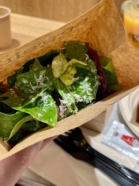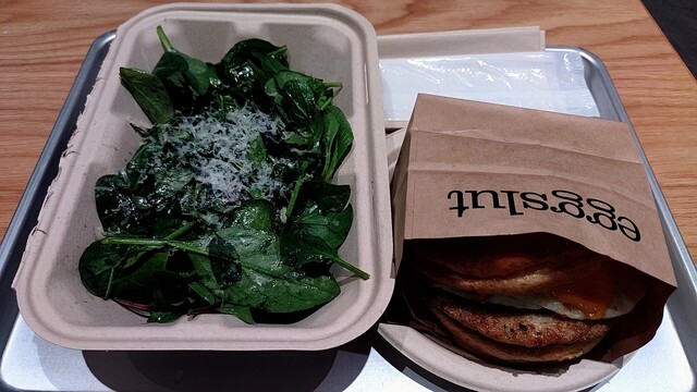 過去にルート20やフェアフレを食べたので、ソーセージエッグチーズサンド、ミックスサラダセットを注文、1870円、適切な価格