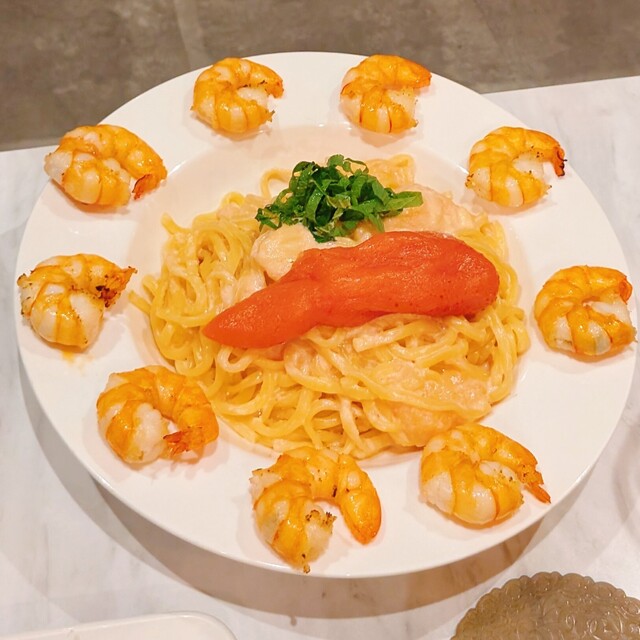 炎の明太子クリームパスタブラックタイガー海老トッピング!