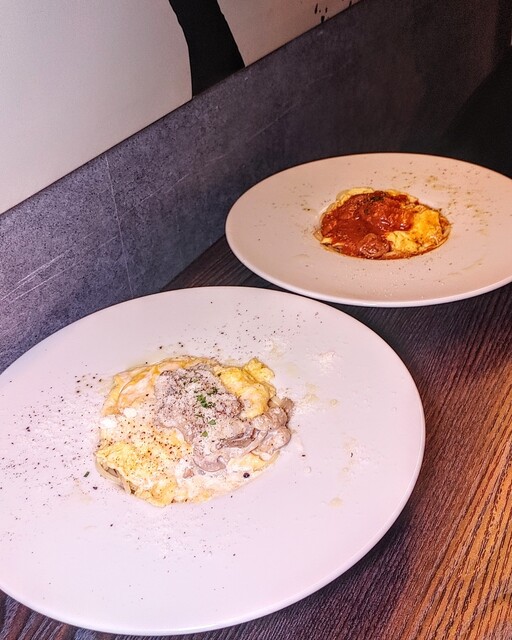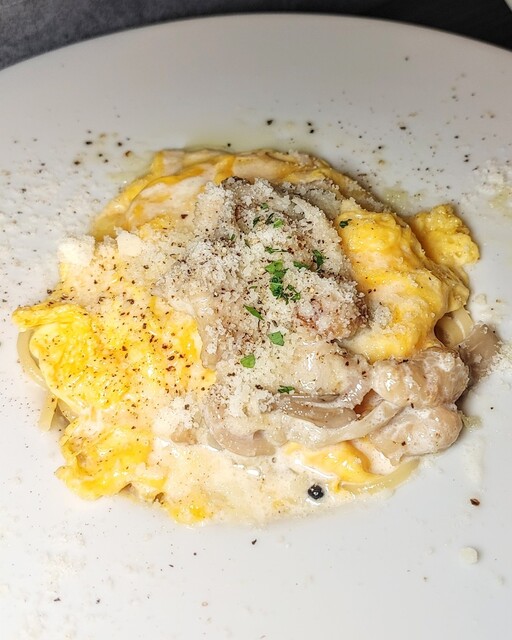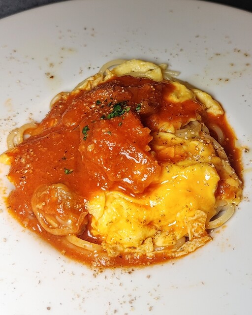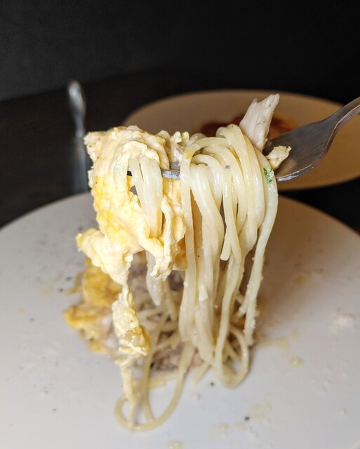 ふわふわ卵といい固さのパスタが合わさって、食感がよいです。
