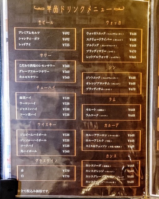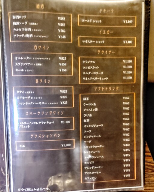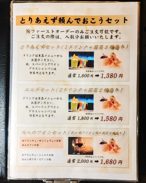 | ドリンク | 焼酎あり、ワインあり、カクテルあり、ワインにこだわる、カクテルにこだわる |