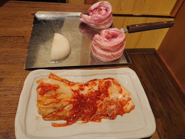 付け合わせは、厚切りにんにくと白菜キムチと玉ねぎ。