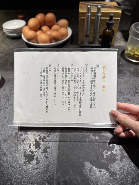 【駄目な隣人】がついに新宿歌舞伎町にオープン!厳選した醤油などで作るスープを堪能できる「醤油ラーメン」は人気の一品。麺やスープ、土鍋で炊いたあきたこまちなど様々なこだわりを詰め込んでおり、また卓上に無料の生卵もございますのでオリジナルのTKGも◎店内は近未来的で、お一人様から女性のお客様までお気軽にご利用いただけます♪人気の「マゼソバ」はテイクアウトも可能ですので、スタッフまでお声がけください。 |