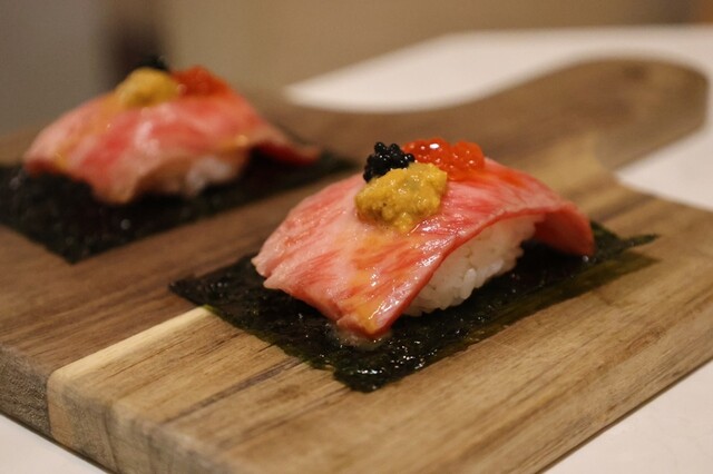 └ひと口サイズのごはんの上に、和牛、雲丹、いくら、キャビアが乗った贅沢寿司✨
