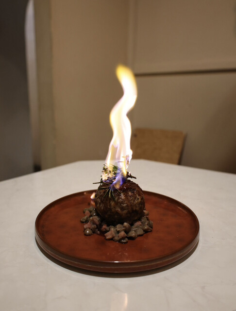 └お店の看板メニューであろう、ぎっしりお肉が詰まったハンバーグ。ローズマリーの香りが食欲をそそる、肉厚ジューシーな一品です◎炎の演出はインスタ映え間違いなし!