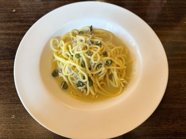 青唐辛子とちりめんじゃこのパスタとサラダを注文。