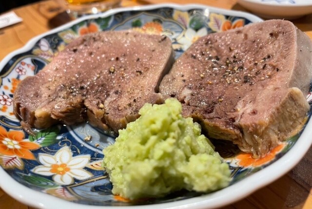 開店前からすでに数組が並んでいて、店内も終始ほどよい賑わい。落ち着いた照明に木目の内装で、ガヤガヤしすぎない“ちょっと良い居酒屋”という雰囲気。まずは名物の茹でタンを注文。これが本当に噂通りで驚いた。