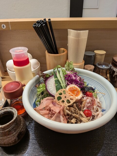 ランチタイムに訪問。 11時半~12時半はランチのピークタイムで結構並びますが、回転は早い方だと思います! 入口のタブレットで前払いするシステムなので、初めての方は少し戸惑うかもしれません。あらかじめ頼むメニューを決めておいた方が無難です。 自分はいつも「ごましゃぶつけ蕎麦」を注文します。... 詳細を見る