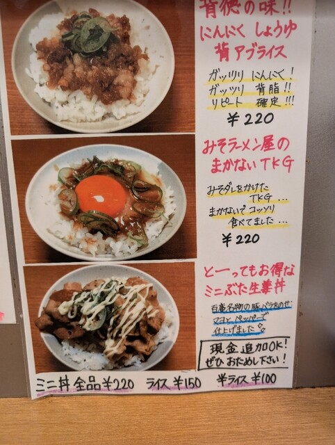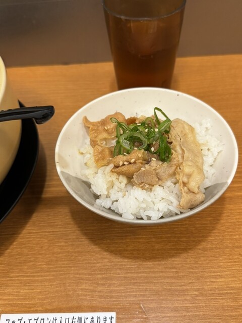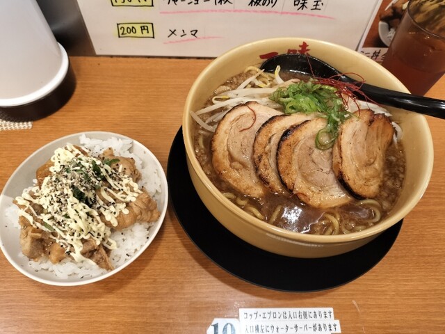 赤味噌を食べましたが、独特な味でした。チャーシュー麺にしたら豚の生姜焼きは乗らなかったので、こちらもミニ豚丼を追加して良かった。