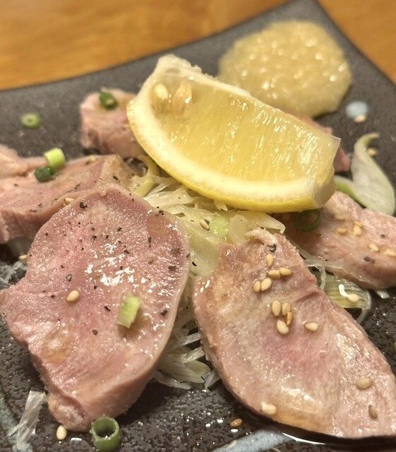 炭火の香ばしさがしっかりまとった厚切りタンは弾力があり、噛むほど旨みが広がる。鉄板の余熱で最後までジューシーに楽しめる一品。