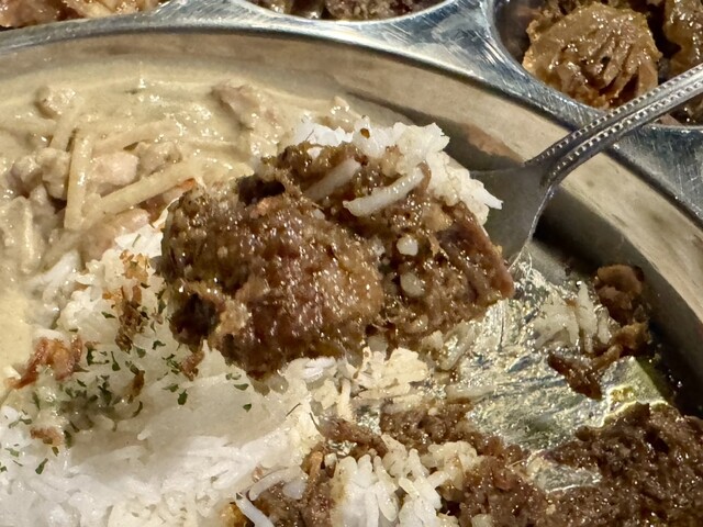 ①ルンダン(牛肉等のかたまり肉をココナッツミルクで煮込んだ、東南アジアのカレー)